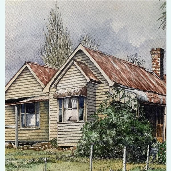 A framed painting in ink and watercolours of a traditional Australian house set in a rural landscape. The scene includes an old timber cottage with a red, corrugated iron roof, weathered siding, and surrounded by some trees and shrubs, including a prominent palm tree in the foreground. The overall tone suggests a quiet, nostalgic view of country life