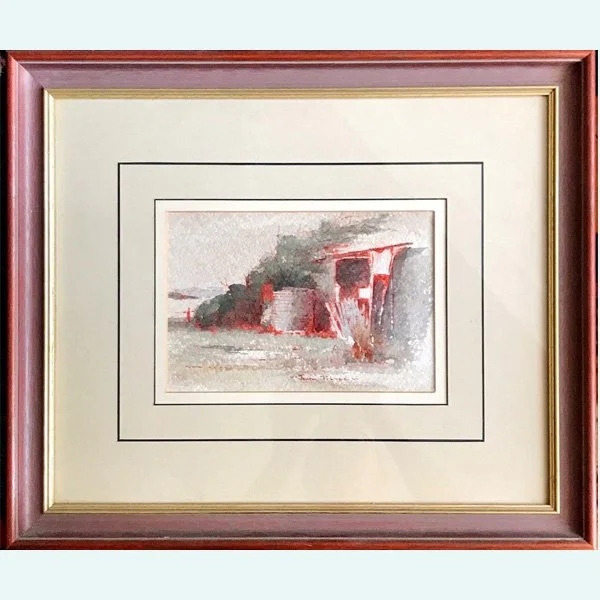 Small framed watercolor painting of red shed and water tank, white cream matting and red wooden picture frame, simple and elegant style, soft edges and atmospheric effects, rural Australia core theme, light gray and dark brown, loose sketch, highly detailed, neutral color palette, low contrast, low key